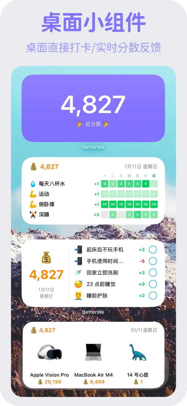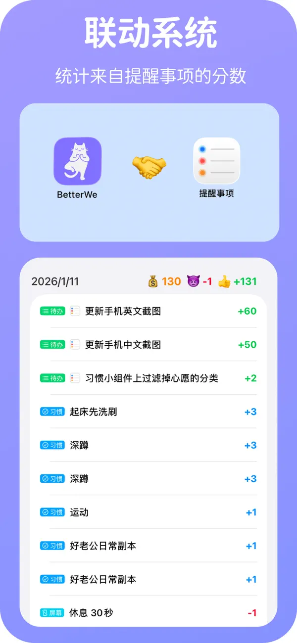 BetterWe - 习惯打卡 · 待办完成 · 心愿实现 - BetterWe 是一款游戏化、以积分奖励为核心的打卡 App。 可以通过习惯打卡和完成待办获得积分,并用这些积分兑换自己设定的心愿。可以一定程度上减少冲动消费,让奖励变得更有意义。 Better... | 独立产品契约