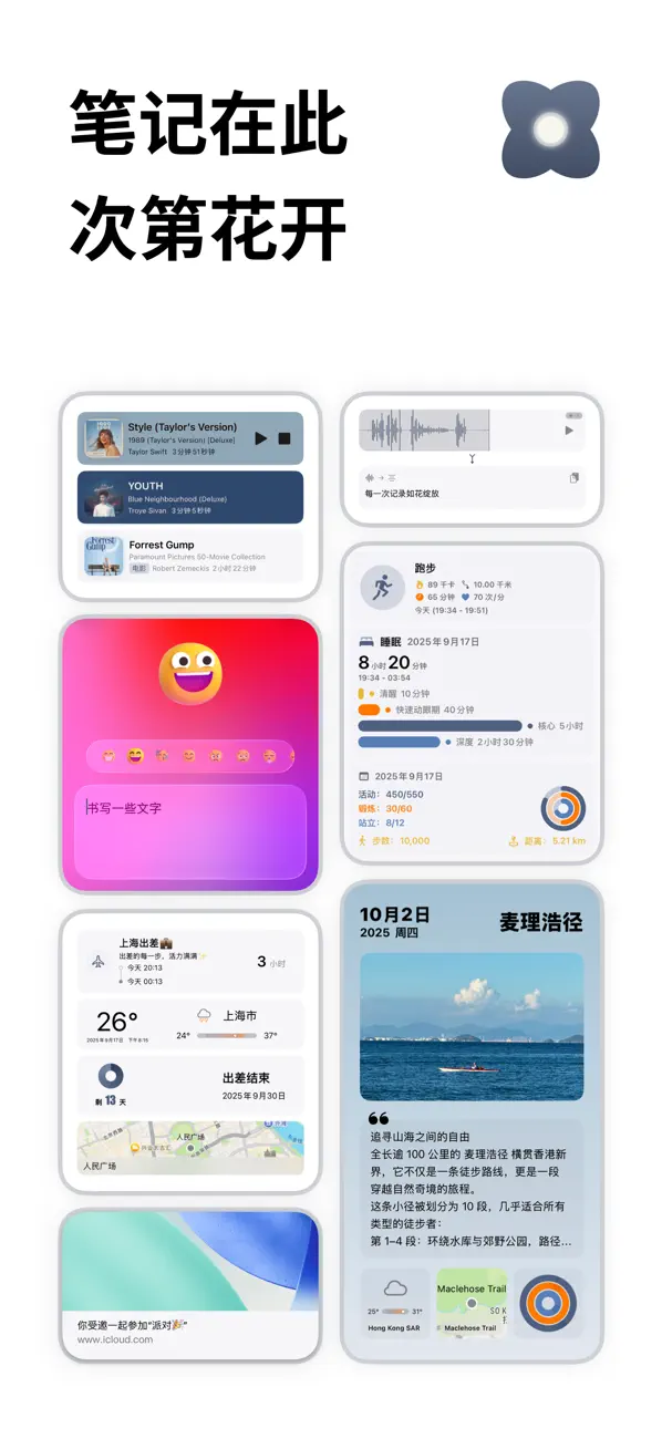 1. 海拔块全新上线:拍摄时自动记录海拔高度,并可展示日出 / 日落时间, 2. 路线规划功能:支持添加多个路线、智能优化路径,并可加入待办提醒,轻松管理行程计划。 3. 工具栏自由定制,现在你可以按照自己的习惯,自由调整笔记工具栏,让记录更加顺手顺心。 4. 提升性能与稳定性,让书写与浏览更加流畅。