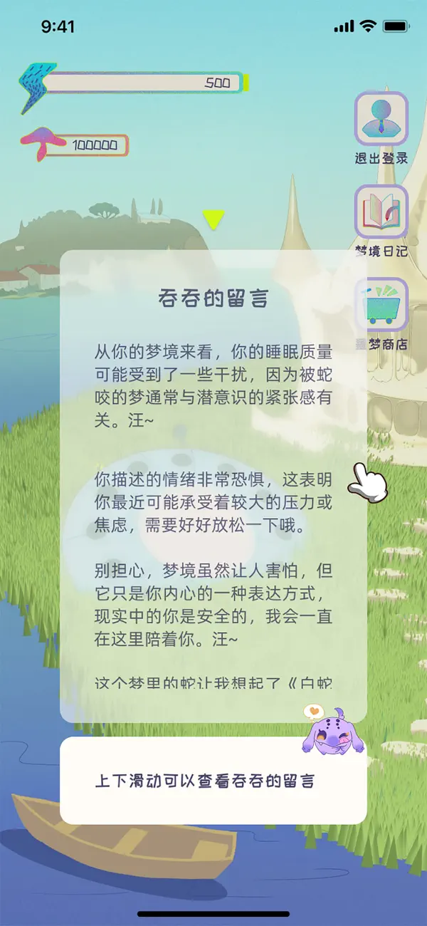 《吞吞日记》是一款AI梦境养成的休闲APP,您可以将所有的梦境投喂给外星狗吞吞,它会进入您的梦境生活,并记录下梦中发生的新故事成为梦境日记。本APP使用临床梦境咨询中的“小孩疗法”,经常做噩梦的用户长期投喂梦境同样具有一定的心理疗愈功能。本产品处于长线迭代中,欢迎用户给予反馈。