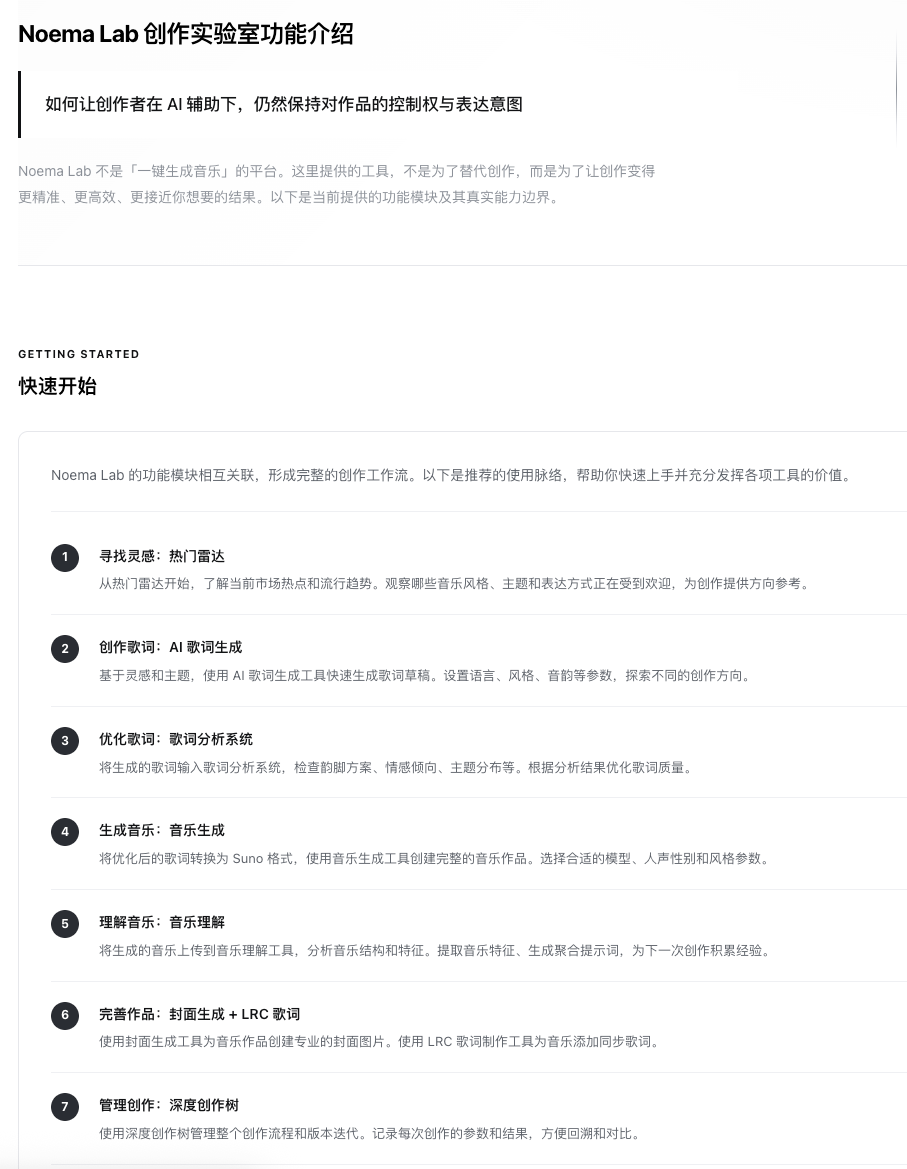 Noema Lab 不是「一键生成音乐」的平台。这里提供的工具,不是为了替代创作,而是为了让创作变得更精准、更高效、更接近你想要的结果。