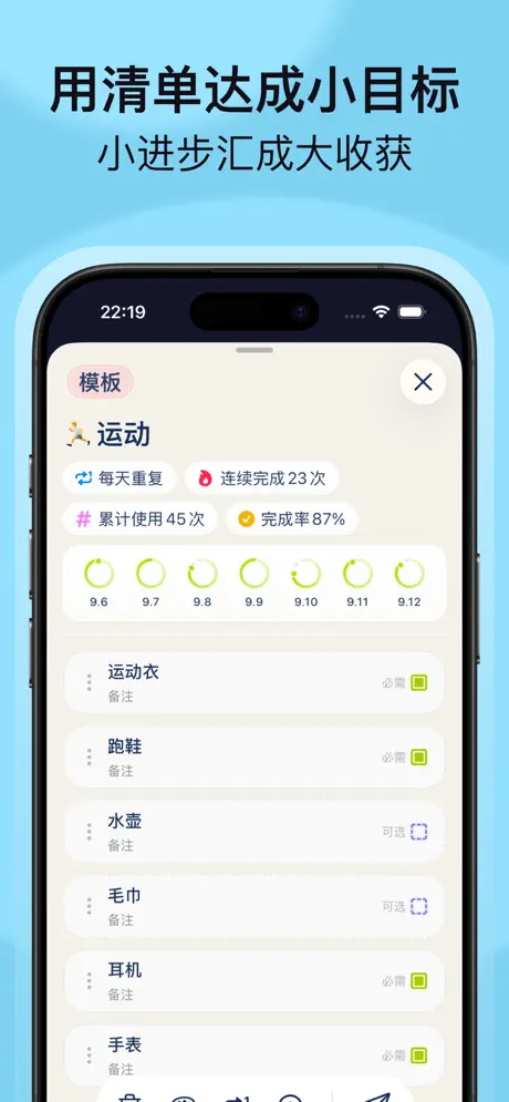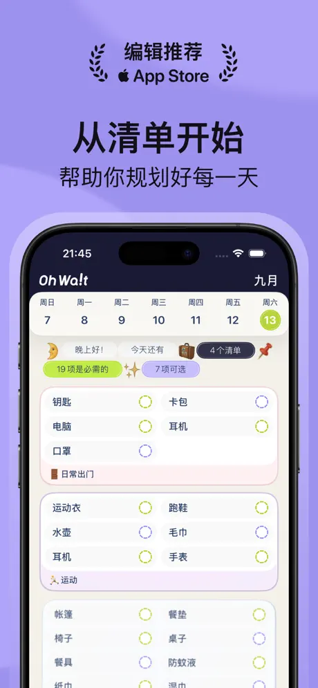 OhWait专注于「出门场景+每日目标」,帮你把准备、执行和坚持都交给清单去管理。
