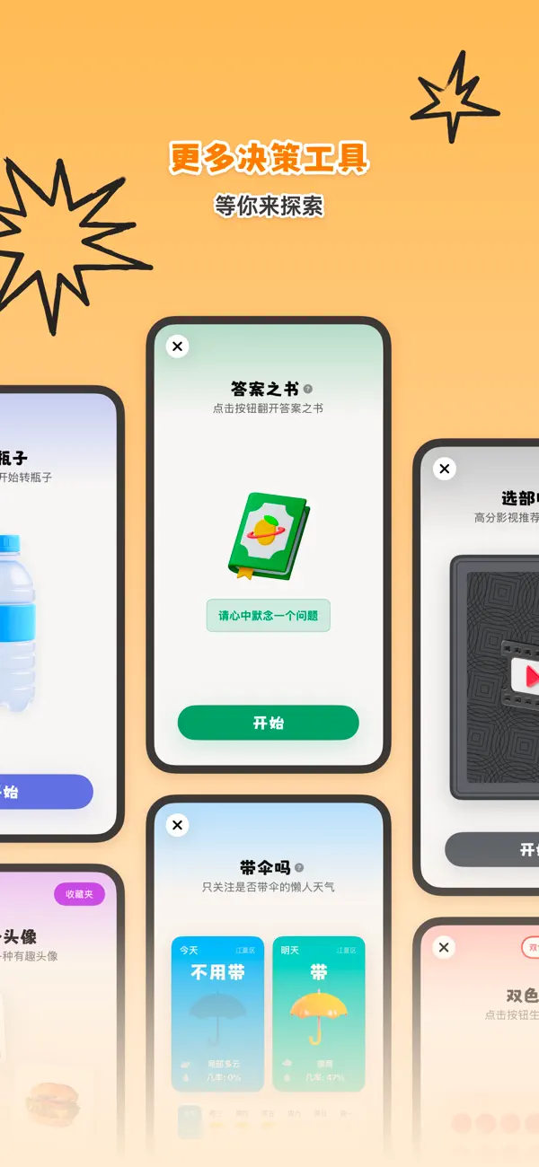 【功能更新】功能更强大啦! - 「大转盘」全面升级,可创建并保存多个转盘,支持分区概率设置、不重复模式等个性化设置项。 - 全新「随机盒子」决策工具,可创建并保存多个随机盒子,支持自定义词条、抽取数量等,满足各种随机生成需求。 - 「今天吃什么」支持自定义编辑食物,并能同步至小组件,新增快捷跳转开关 【优化与修复】 - 修复“转盘”和“随机盒子”会重复创建的问题 - 优化界面设计细节 - 更新小组件的工具快捷入口