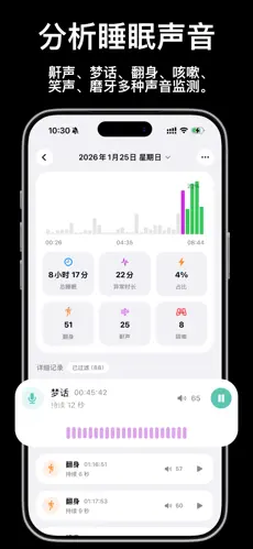 1. 全新睡眠声音监测:提供鼾声、梦话、翻身等多达6种睡眠声音的追踪与分析 2. 全新1月睡眠挑战上线:来听听C·弗拉梅尔的故事 3. 部分文案与逻辑的优化