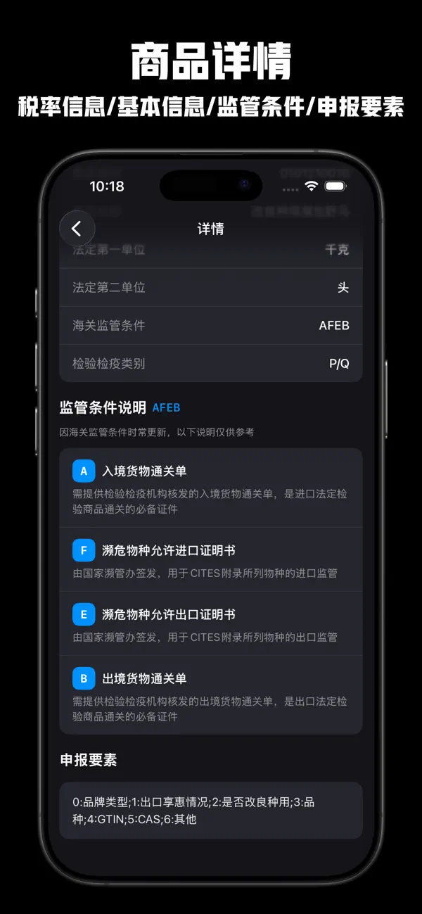 完整展示最惠国进口税率、普通进口税率、暂定进口税率、消费税率、出口关税率、出口退税率、增值税率等七大税率类型,一目了然掌握商品税务成本。