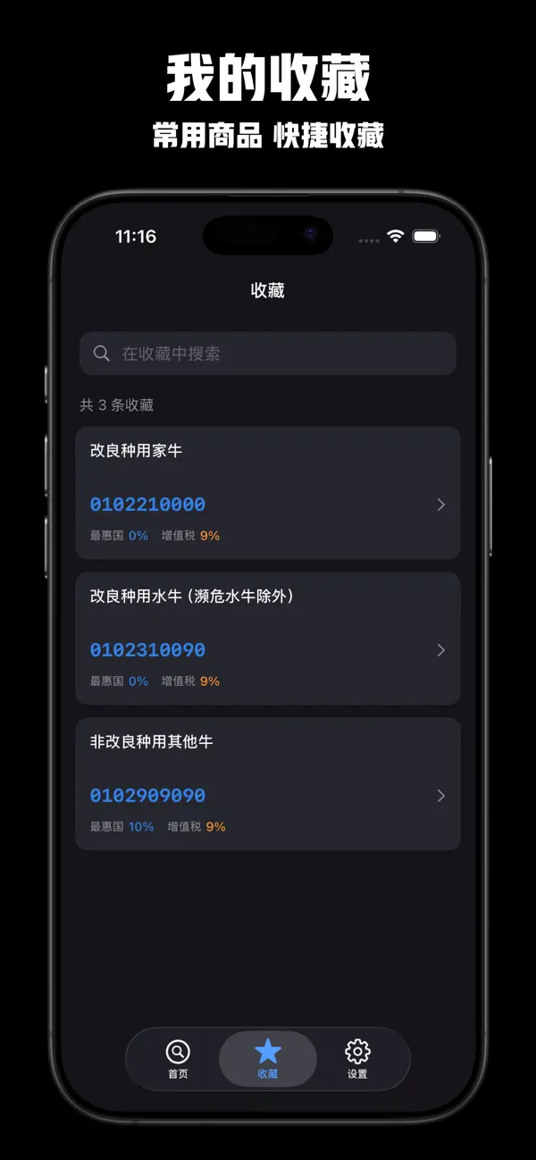 支持收藏常用商品编码,建立个人税则库。收藏列表支持搜索筛选,快速找到需要的商品信息。