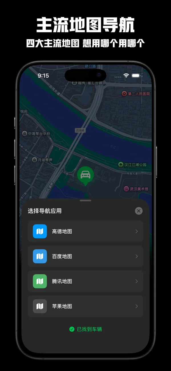 支持高德地图、百度地图、腾讯地图和苹果地图四大主流导航应用。取车时一键调用您常用的地图应用,快速规划最优路线,轻松找到爱车。