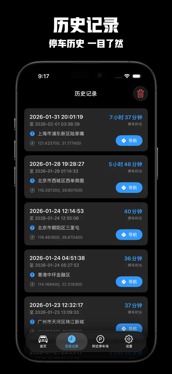 所有停车记录完全存储在您的设备本地,不会上传到任何服务器。您的位置信息和隐私得到充分保护。
